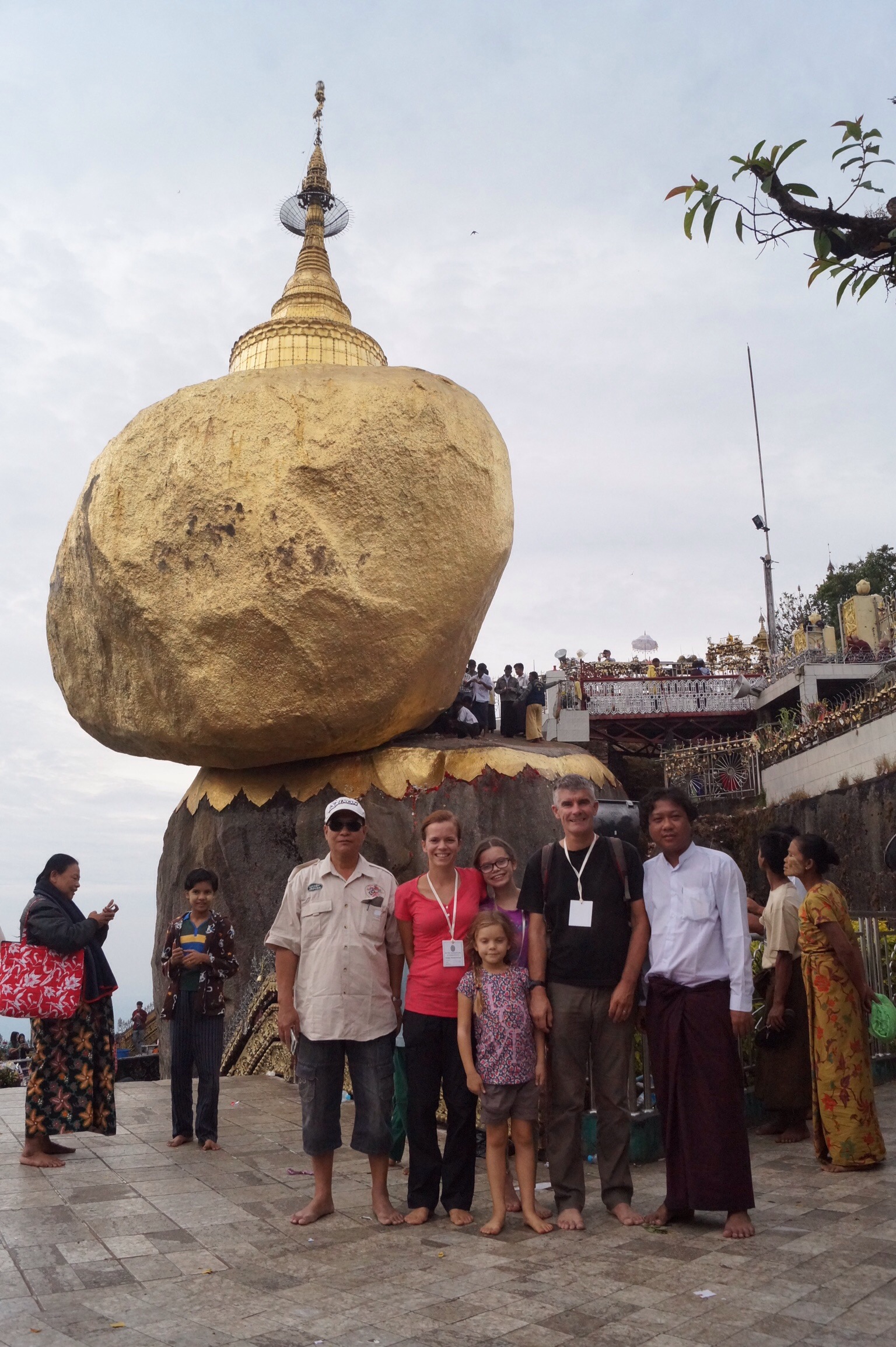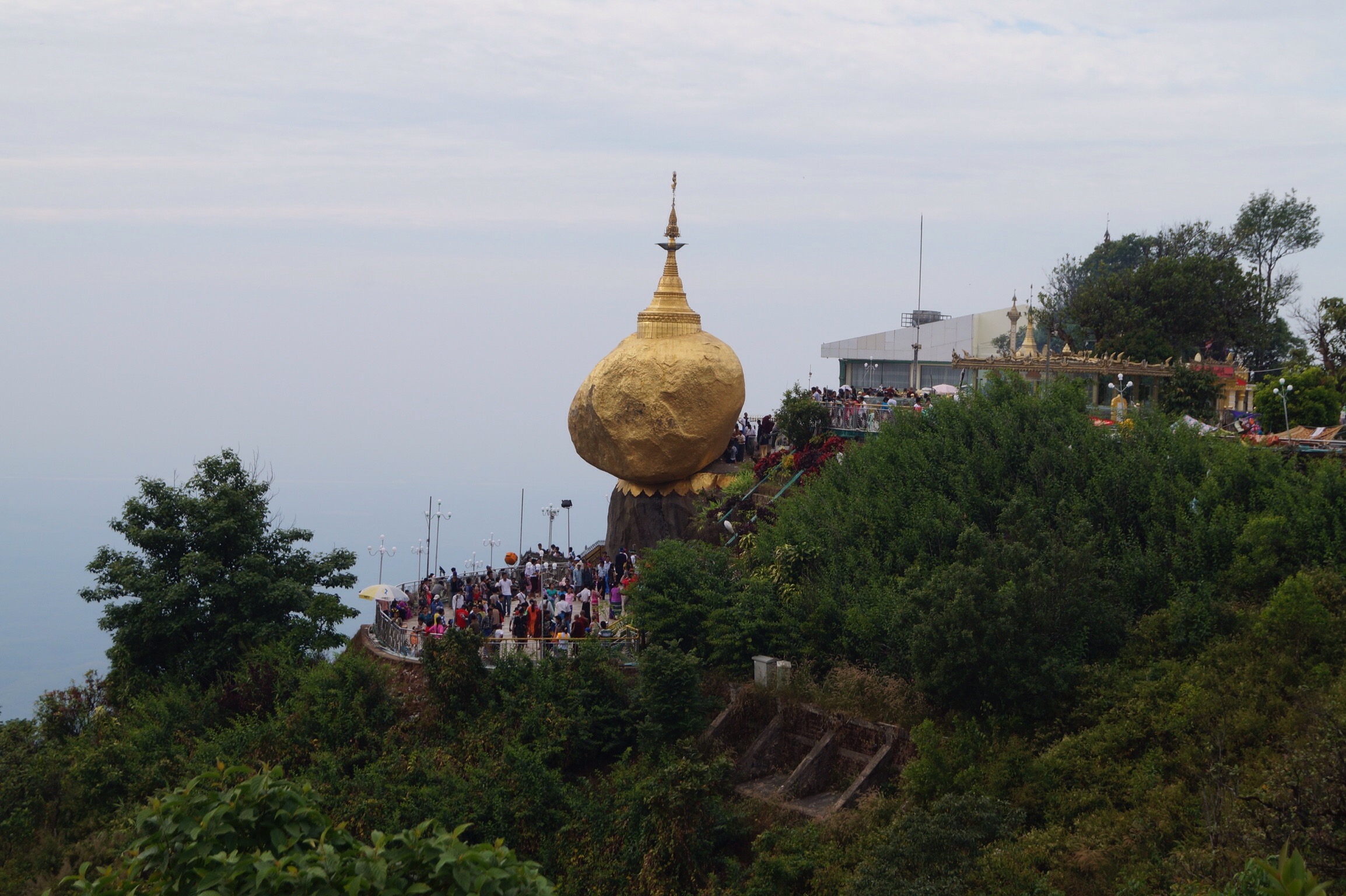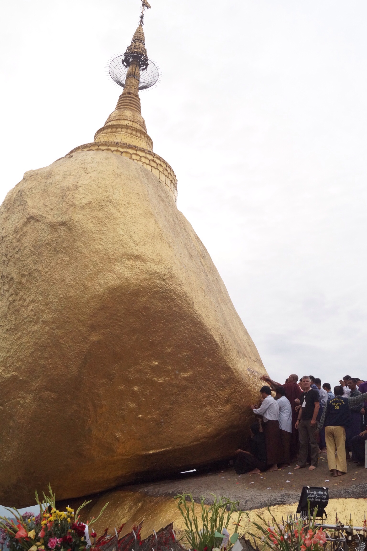 Mt Kyaiktyio ("Golden Rock") is a major pilgrimage sight for Myanmar Buddhists. The day we arrived was also a sort of celebration day for Truck drivers or something, so the hair raising truck transfers up and down the mountain were free. As a result the town at the bottom was thronged with local people. Once we reached the top we had to continue towards the Golden Rock barefoot. People were laying out mats preparing to spend the night up there and all sorts of food was bubbling away. The Golden Rock itself is an enormous Boulder covered in gold leaf balanced precariously on the top of the mountain. Legend says that it is balanced due to a precisely placed Buddha hair in the stupa on top. I have to say it did look finely balanced but even an earthquake in the 1970s had failed to shift it. I (much to Alisha's disgust only men are allowed) was able to touch the rock and add my small piece of gold leaf to it.