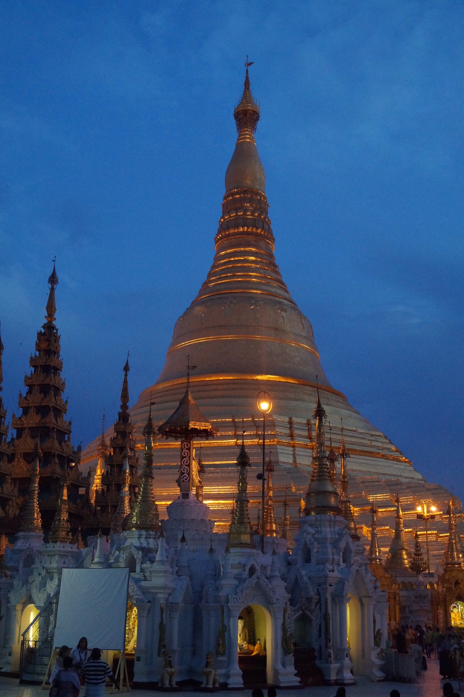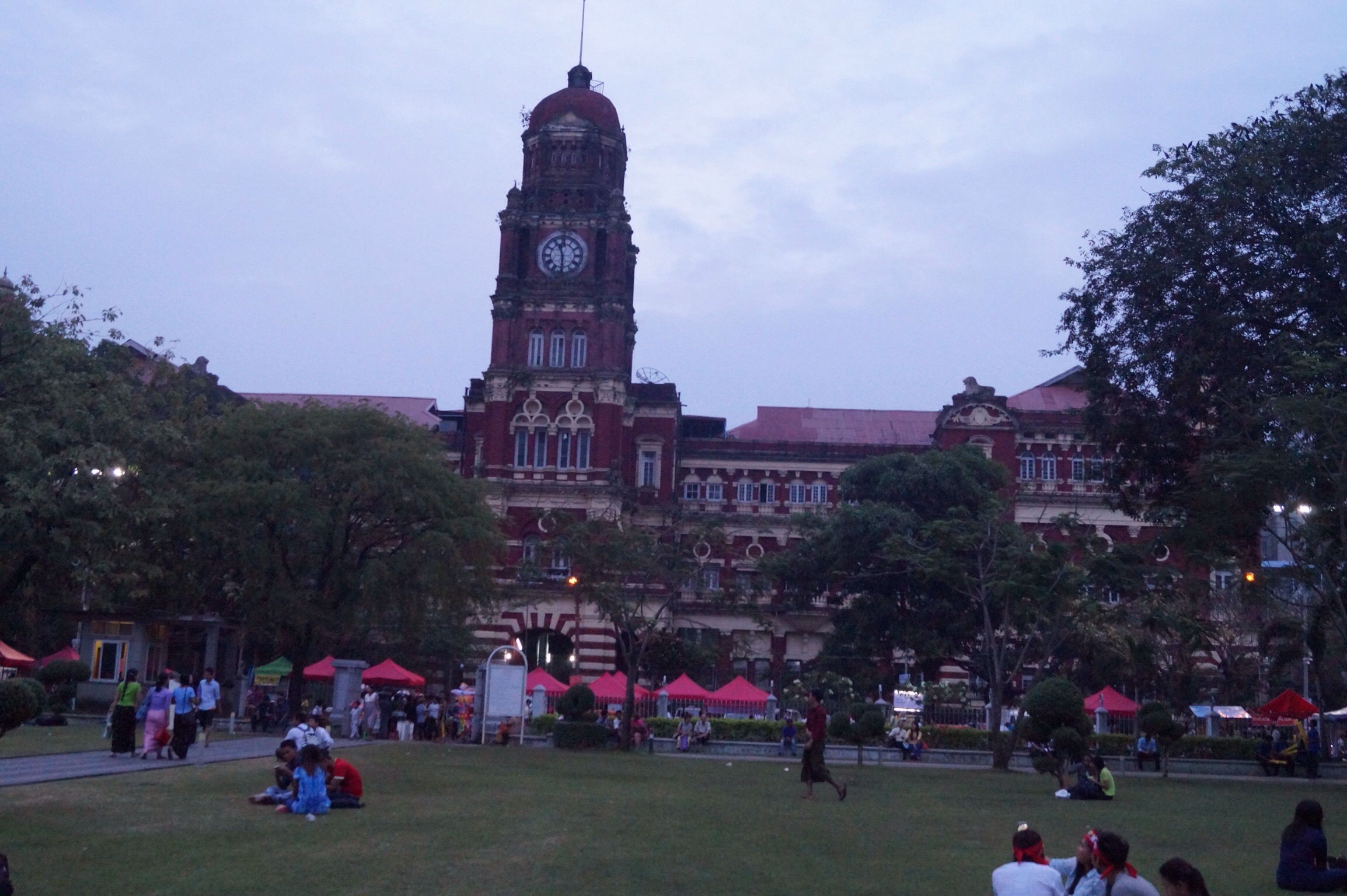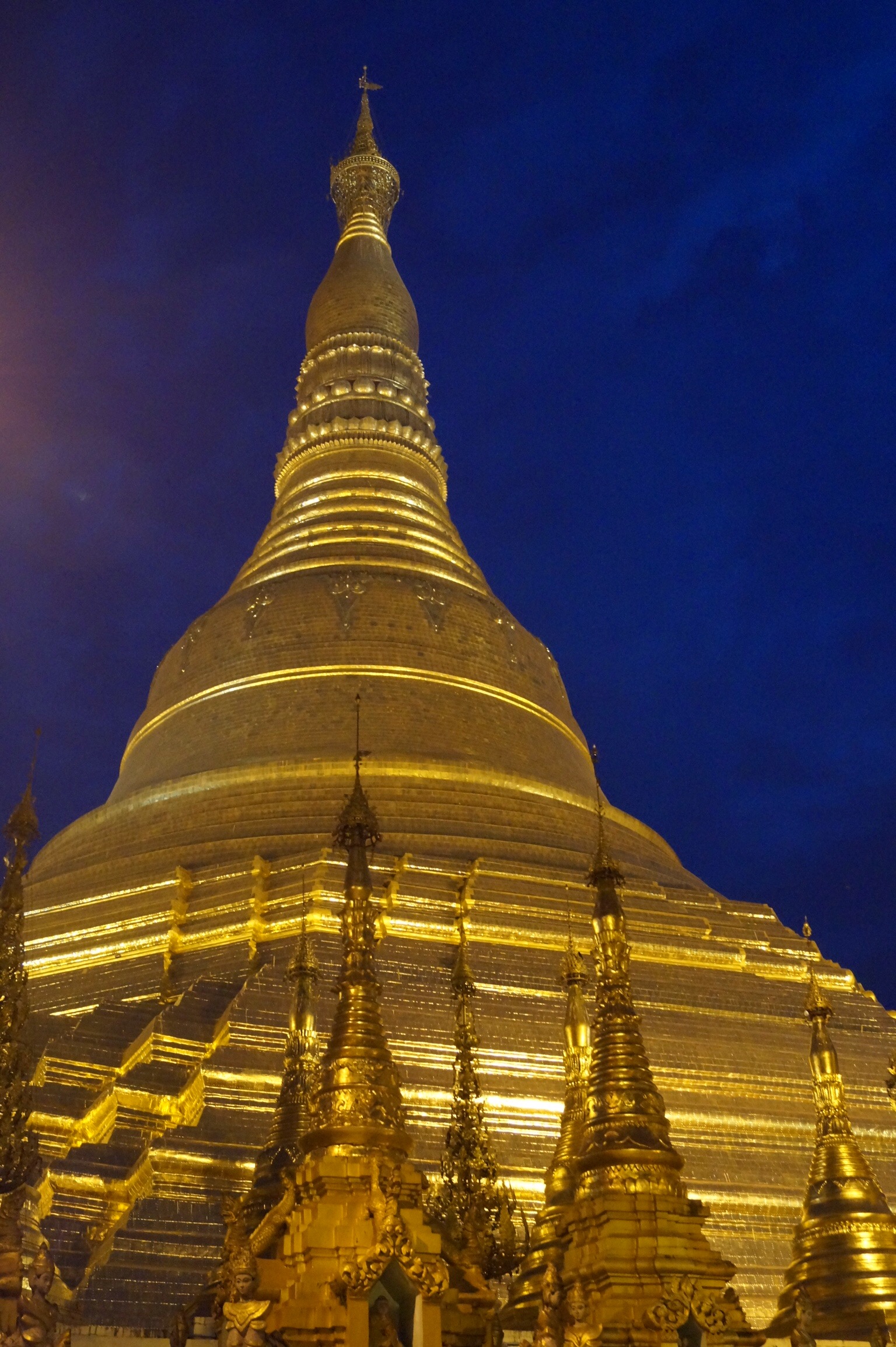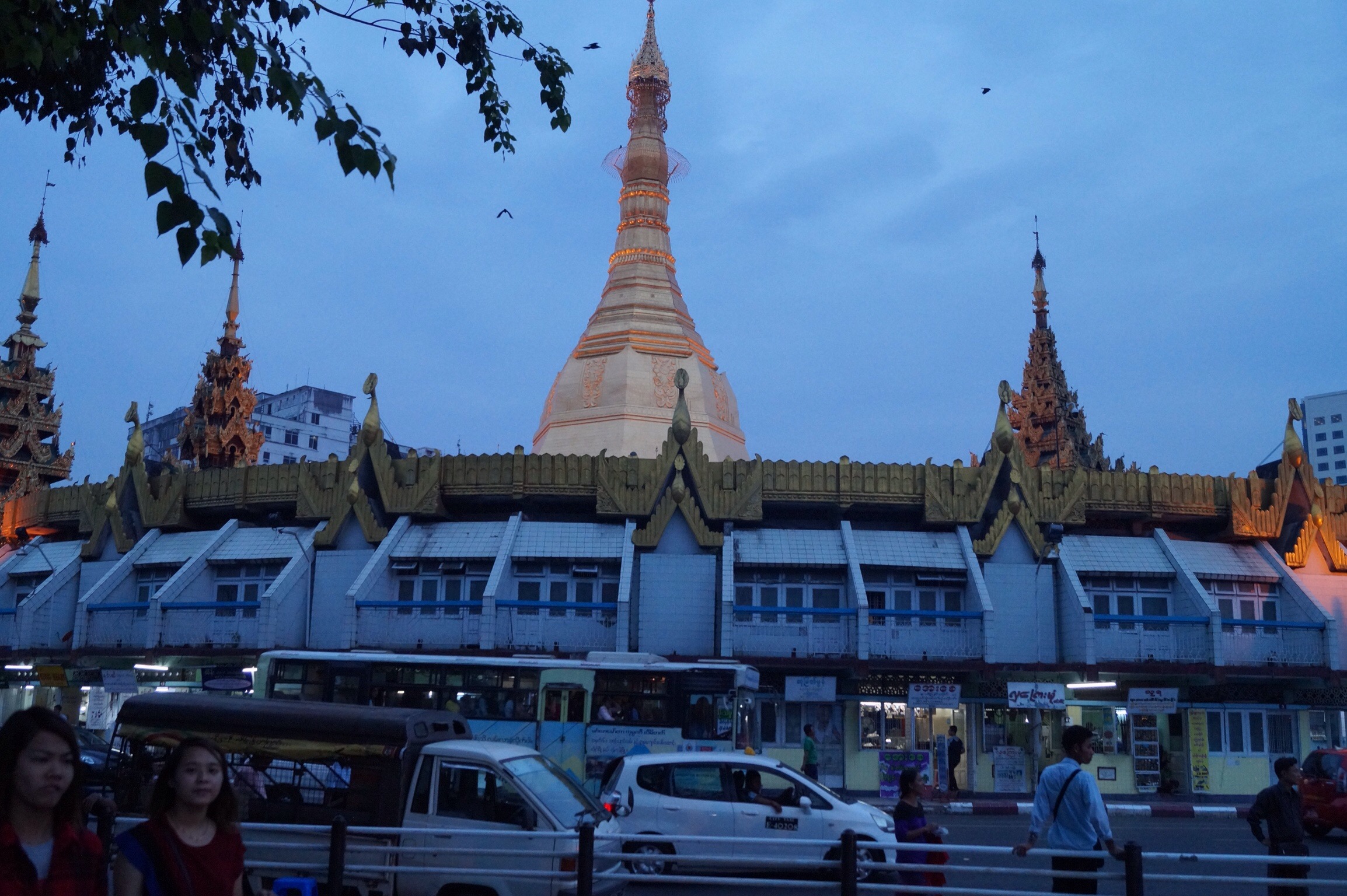 Late in the afternoon we headed out on foot into downtown Yangon. Smoke belching buses chugged past and the pavements were clogged with people hawking their wares. Pedestrians ran the gauntlet trying to cross the clogged street. We thought jumping in a taxi was safer until we saw the way they drove. Weaving in and out of the traffic we arrived at Sule Pagoda which was now surrounded by a giant traffic clogged roundabout. It was much more peaceful inside looking up at the 46m high golden Chedi.