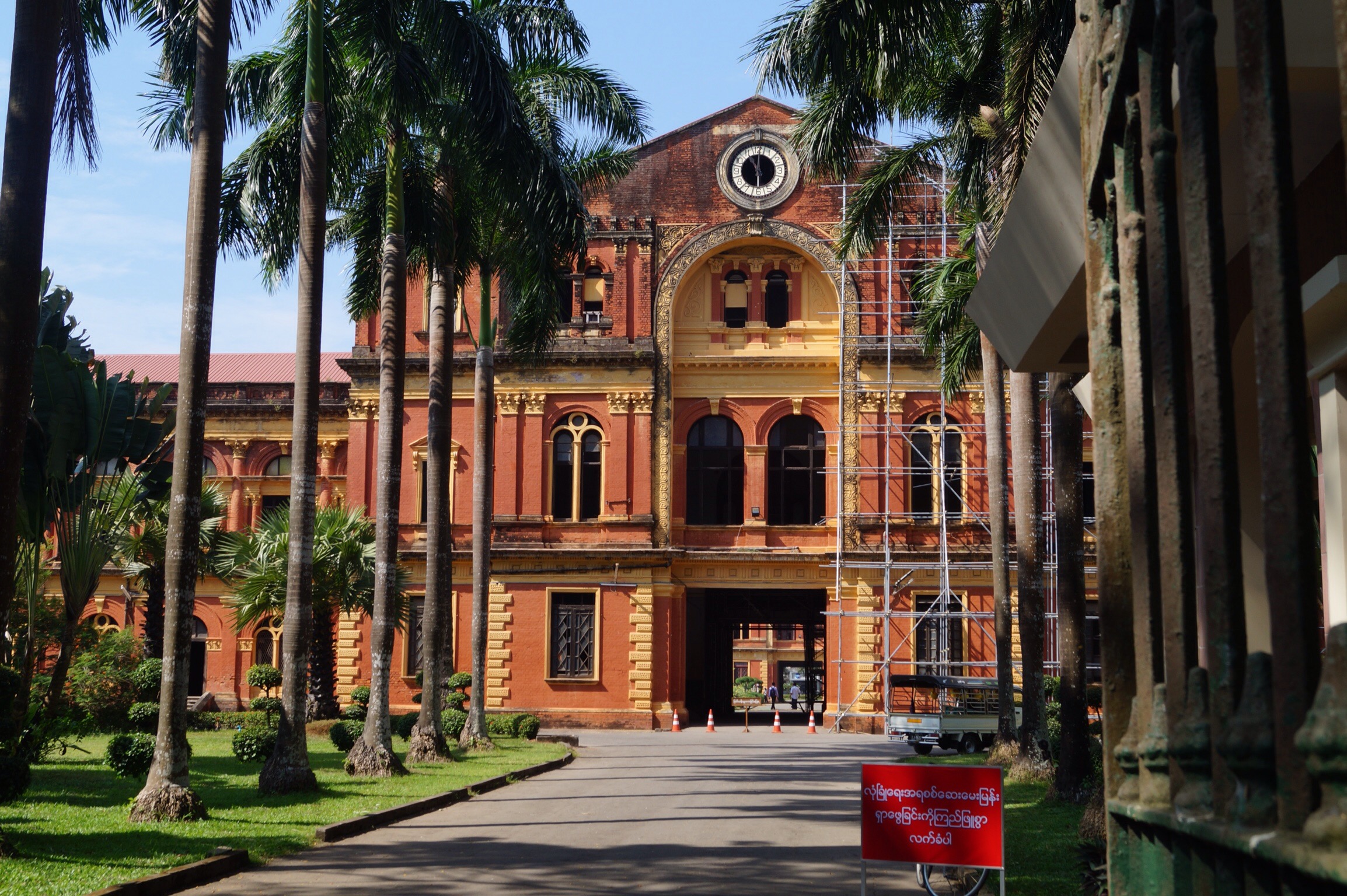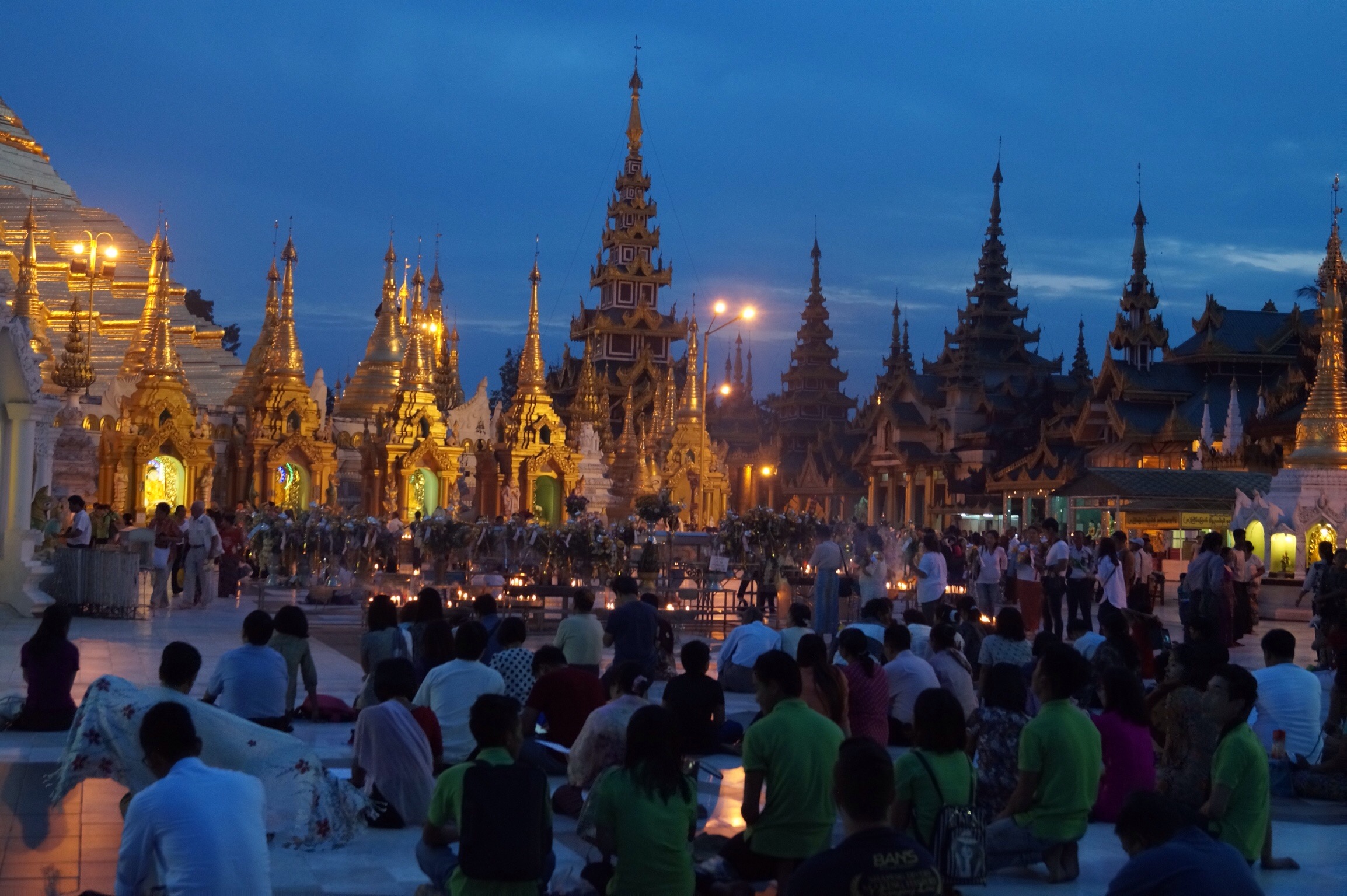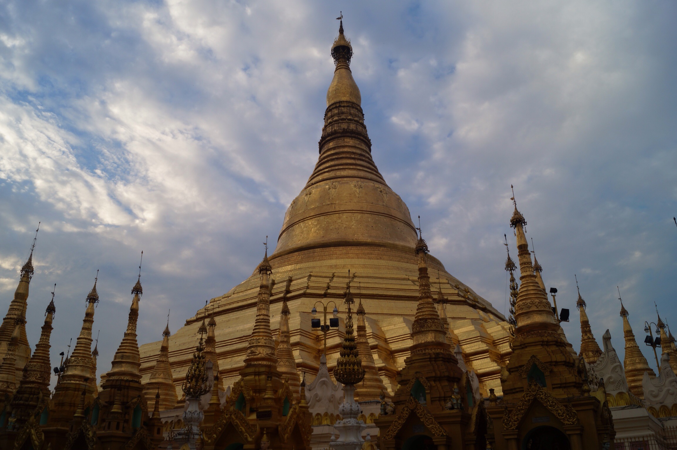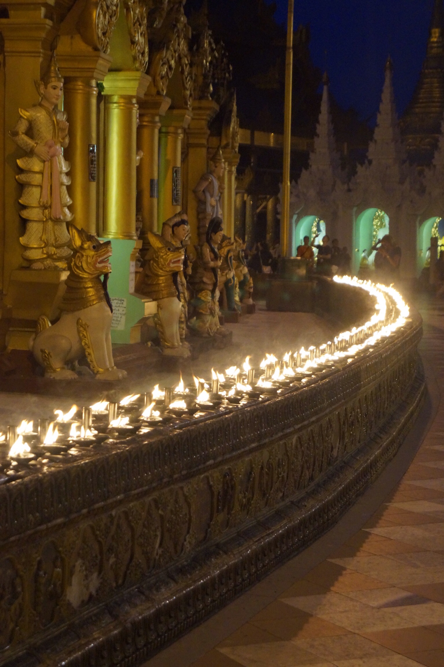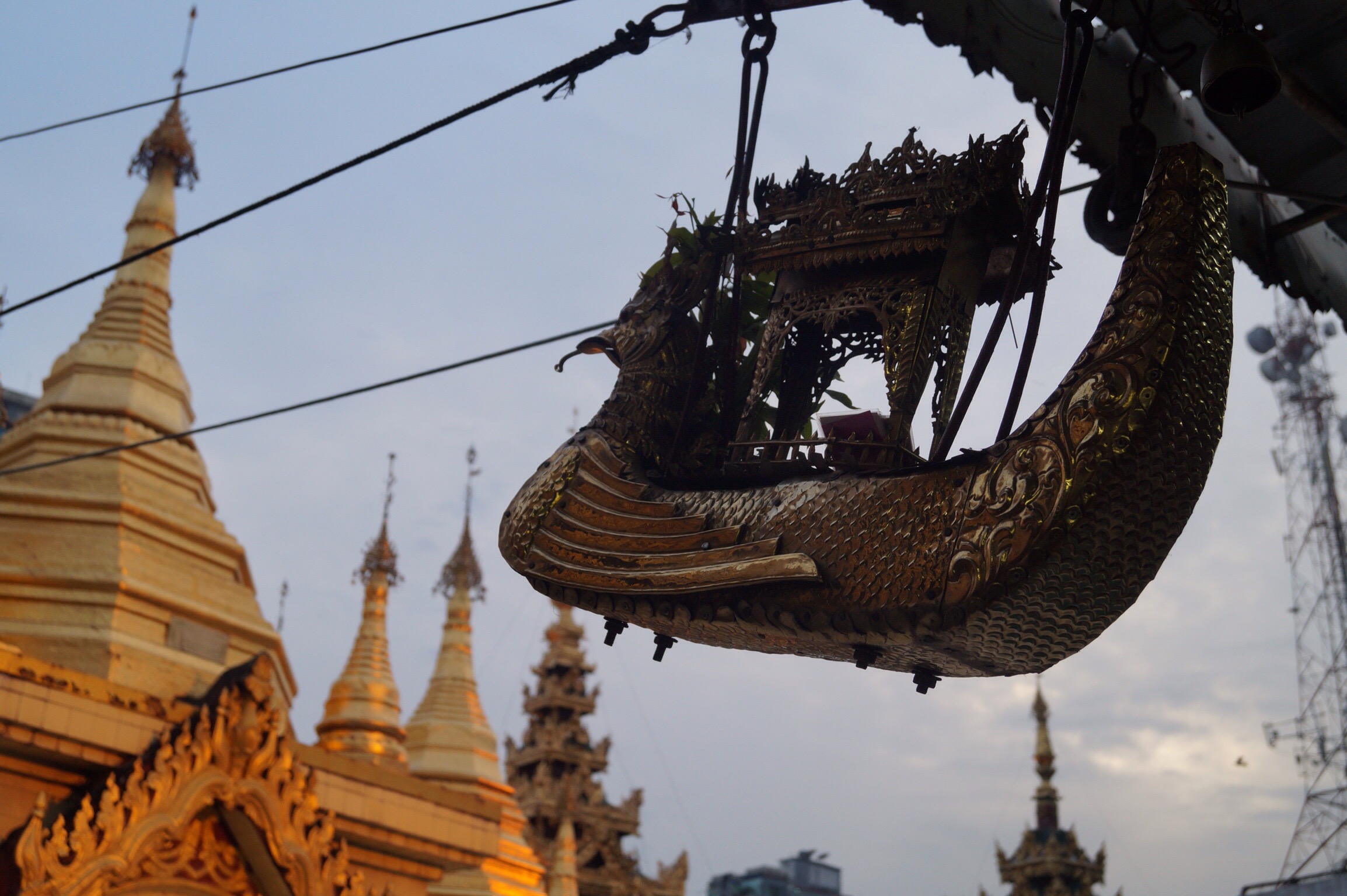 Late in the afternoon we headed out on foot into downtown Yangon. Smoke belching buses chugged past and the pavements were clogged with people hawking their wares. Pedestrians ran the gauntlet trying to cross the clogged street. We thought jumping in a taxi was safer until we saw the way they drove. Weaving in and out of the traffic we arrived at Sule Pagoda which was now surrounded by a giant traffic clogged roundabout. It was much more peaceful inside looking up at the 46m high golden Chedi.