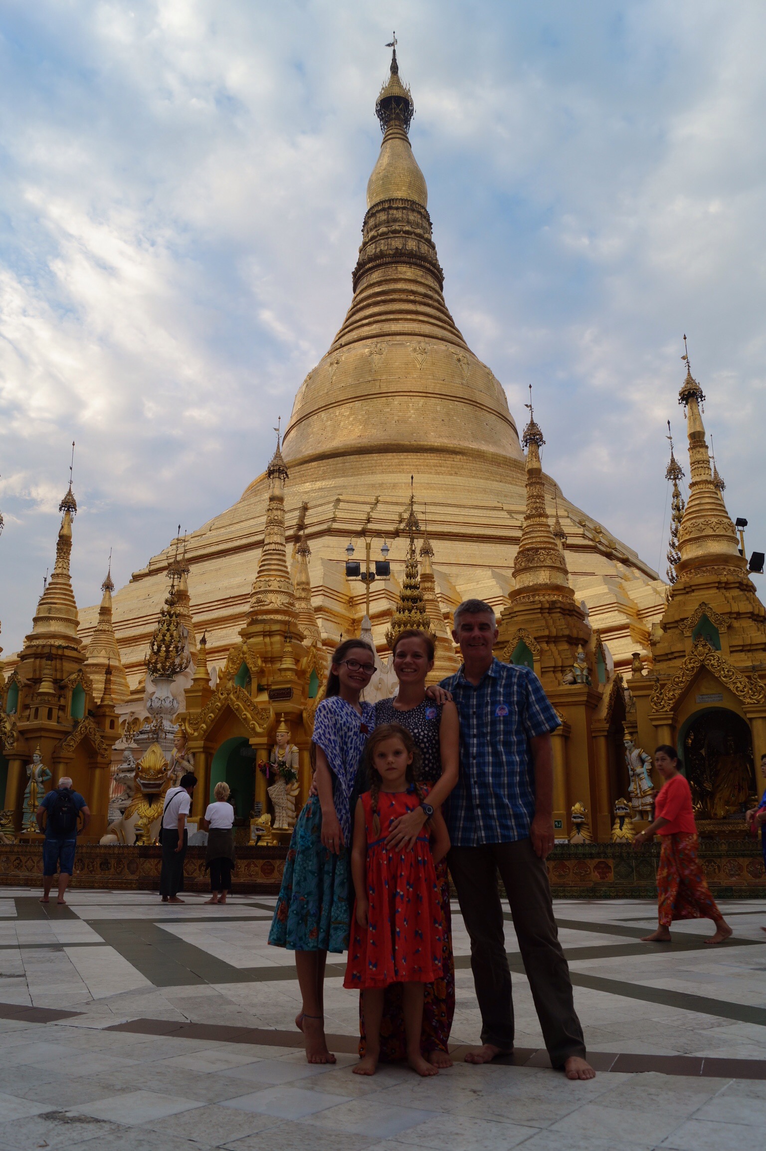 We left the highlight of our visit until last. Shwedagon Paya (where the rest of those Buddha hairs are entombed) is regarded as one of South East Asia's finest temples and it doesn't disappoint. The golden stupa stands 98 metres high and the gold glimmering on the light is the real thing. It's covered with tons of gold leaf and gold plate and right at the top of the stupa set in a jewel encrusted case is a 75 carat diamond. It's a working temple and when we arrived it was alive with pilgrims, monks worshippers and tourists. The girls, especially Lucy, continued to be patient as we circuited the stupa. Since entering Myanmar they have become minor celebrities with local people wanting to take their photos wherever they went and at this temple it was no different.
